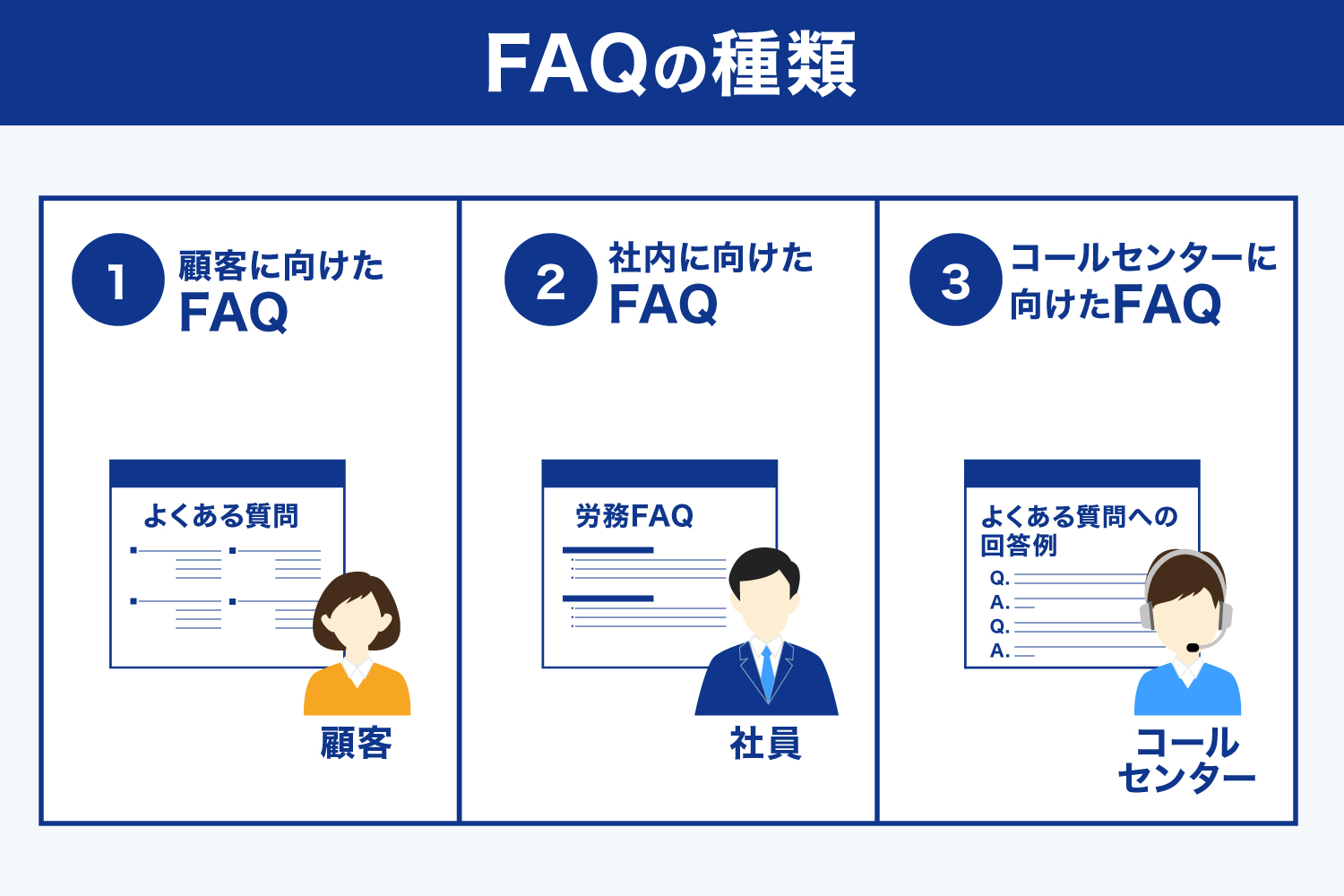 顧客向けのFAQにするのか、自社向けのFAQにするのかなど、FAQの種類は複数のため、目的に応じたFAQを用意することが大切です。