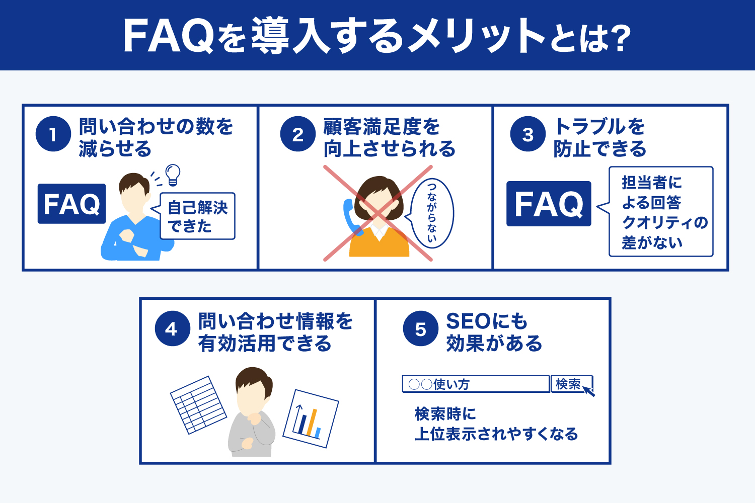 FAQには顧客向け、社内向け、コールセンター向けがあり、いずれも導入することで問い合わせ数や問い合わせ業務にかかるコストの削減が期待できます。