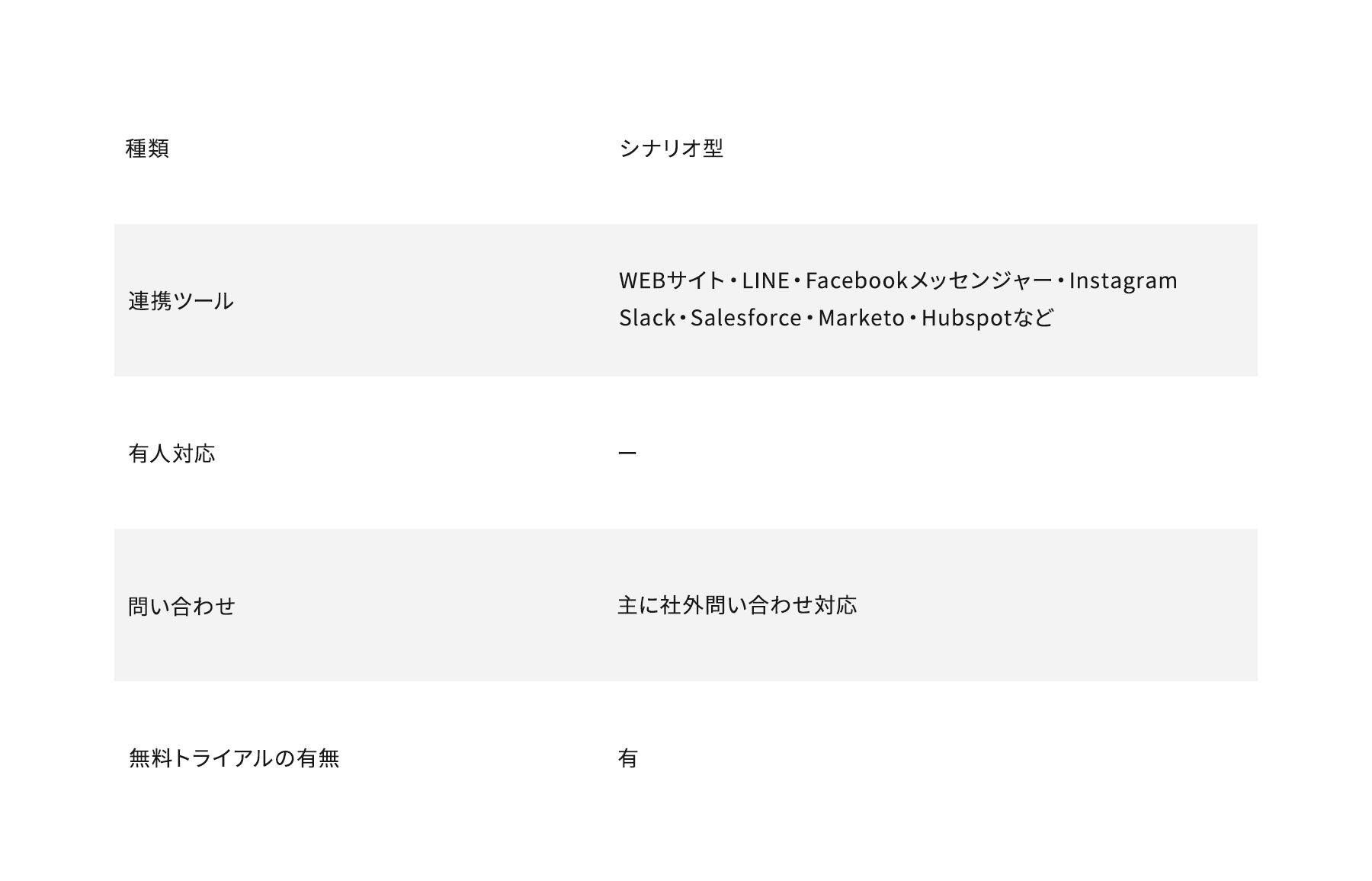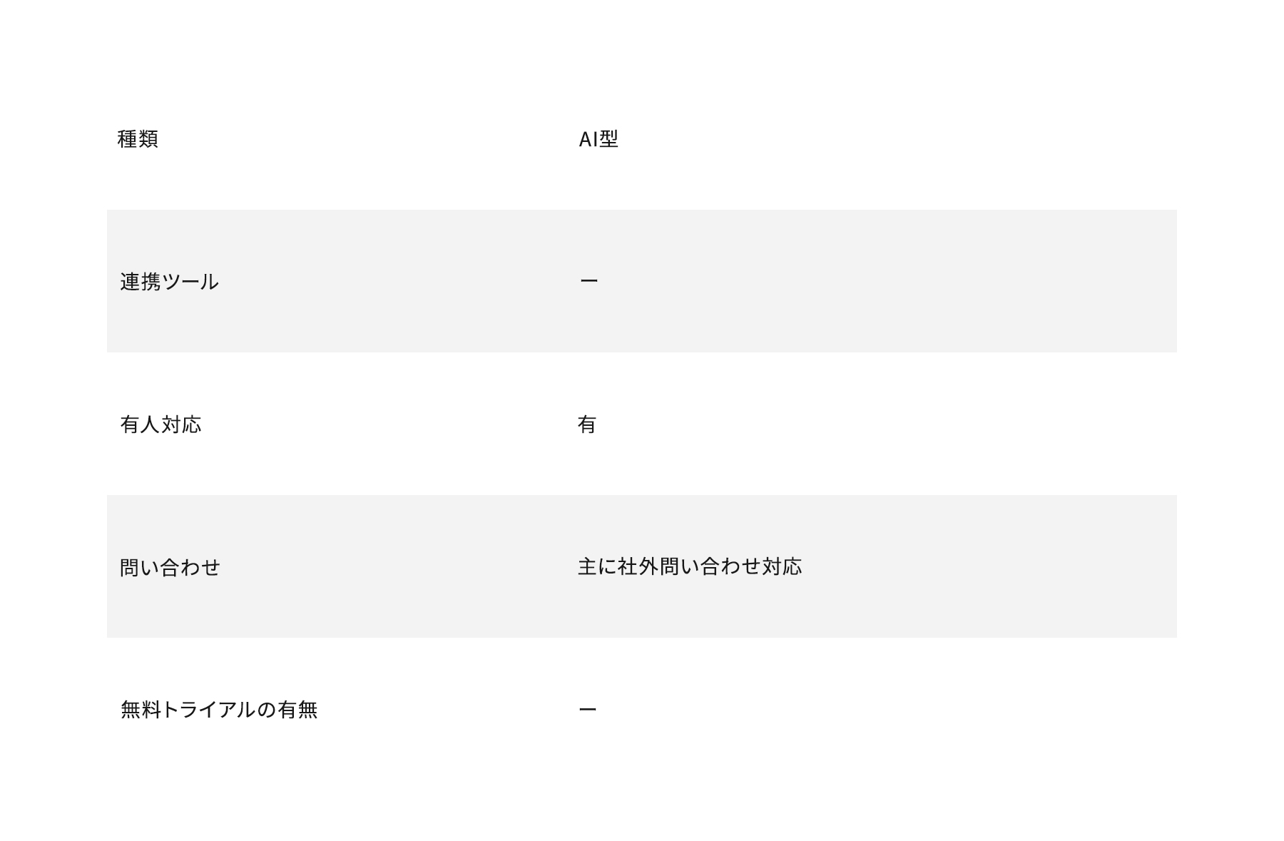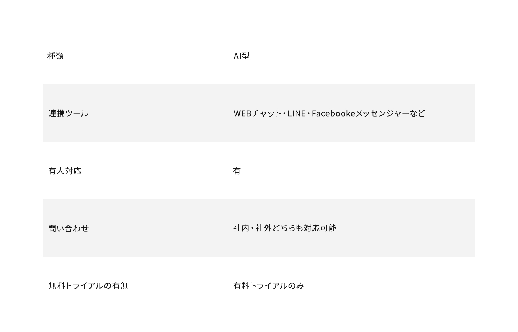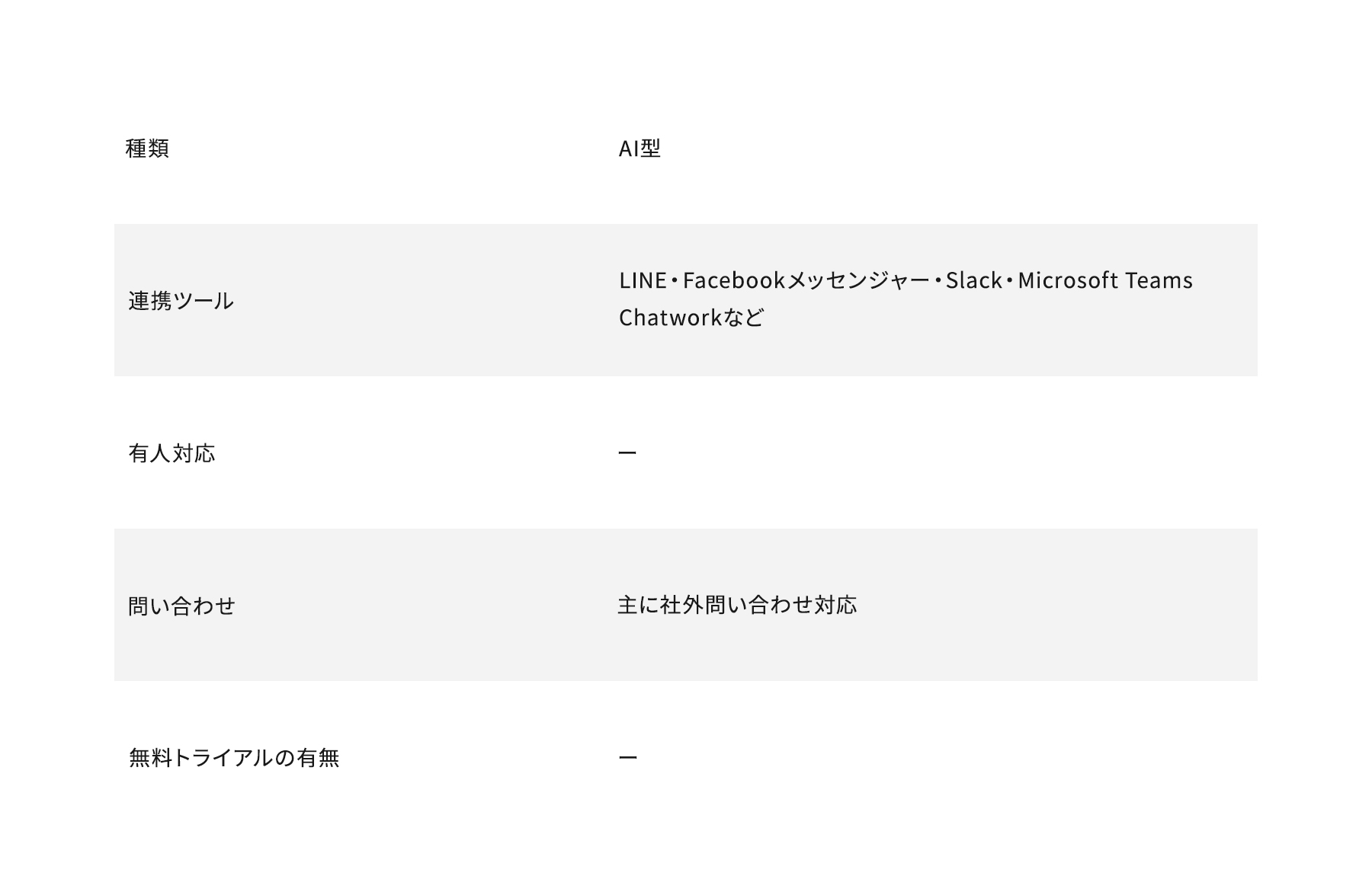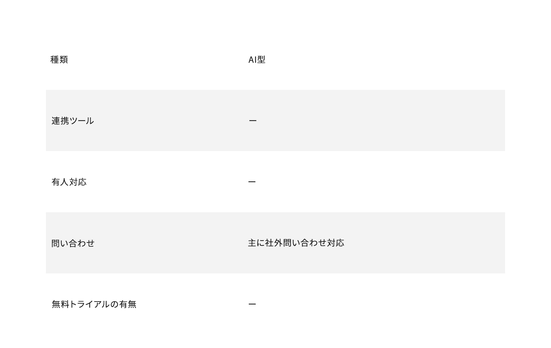 次項から、種類・連携ツール・有人対応・問い合わせ・無料トライアルの有無などに分けて詳しく比較するので参考にしてください。