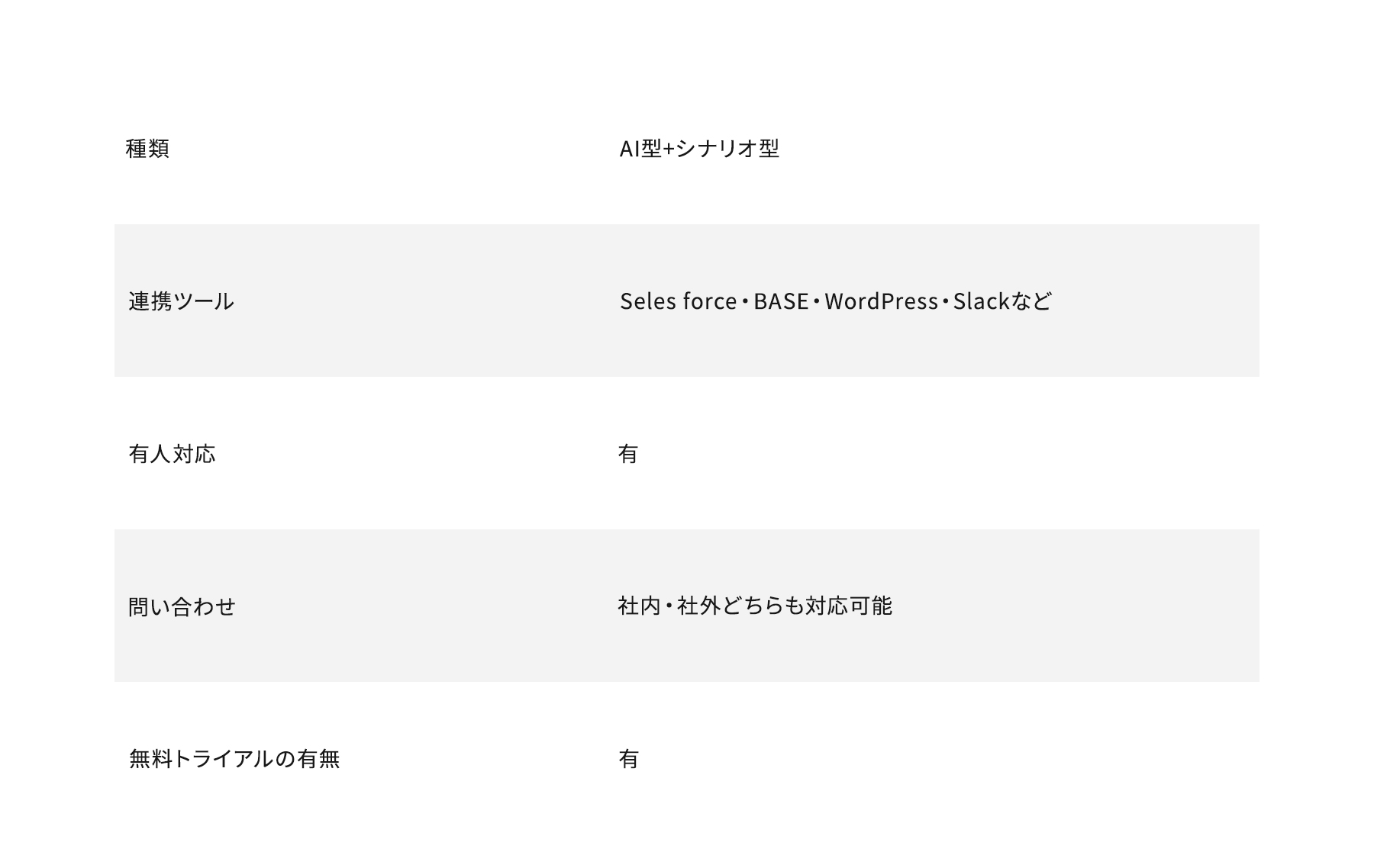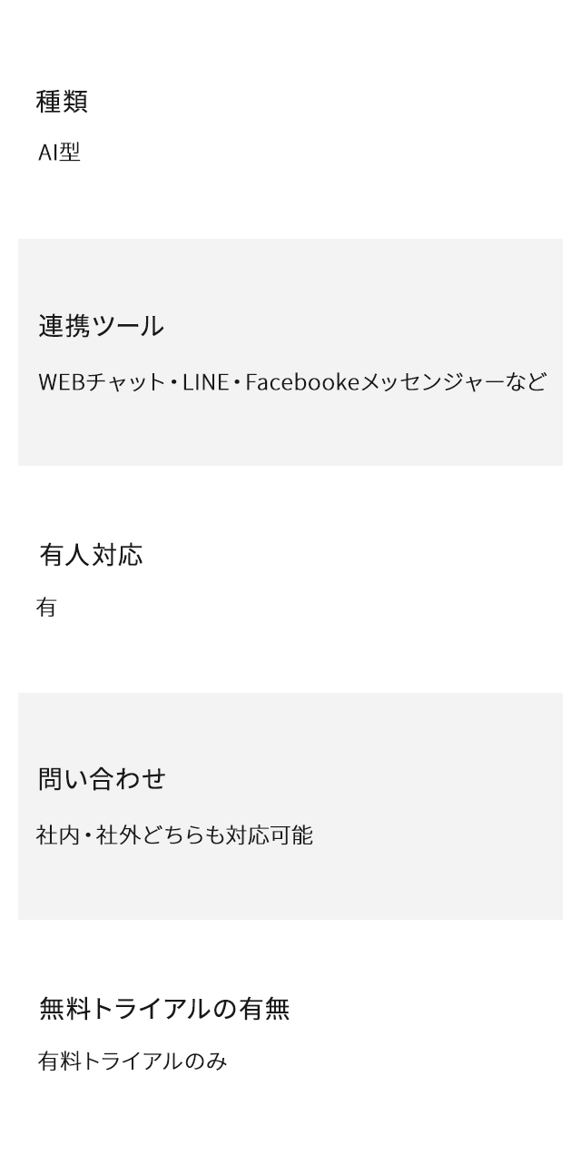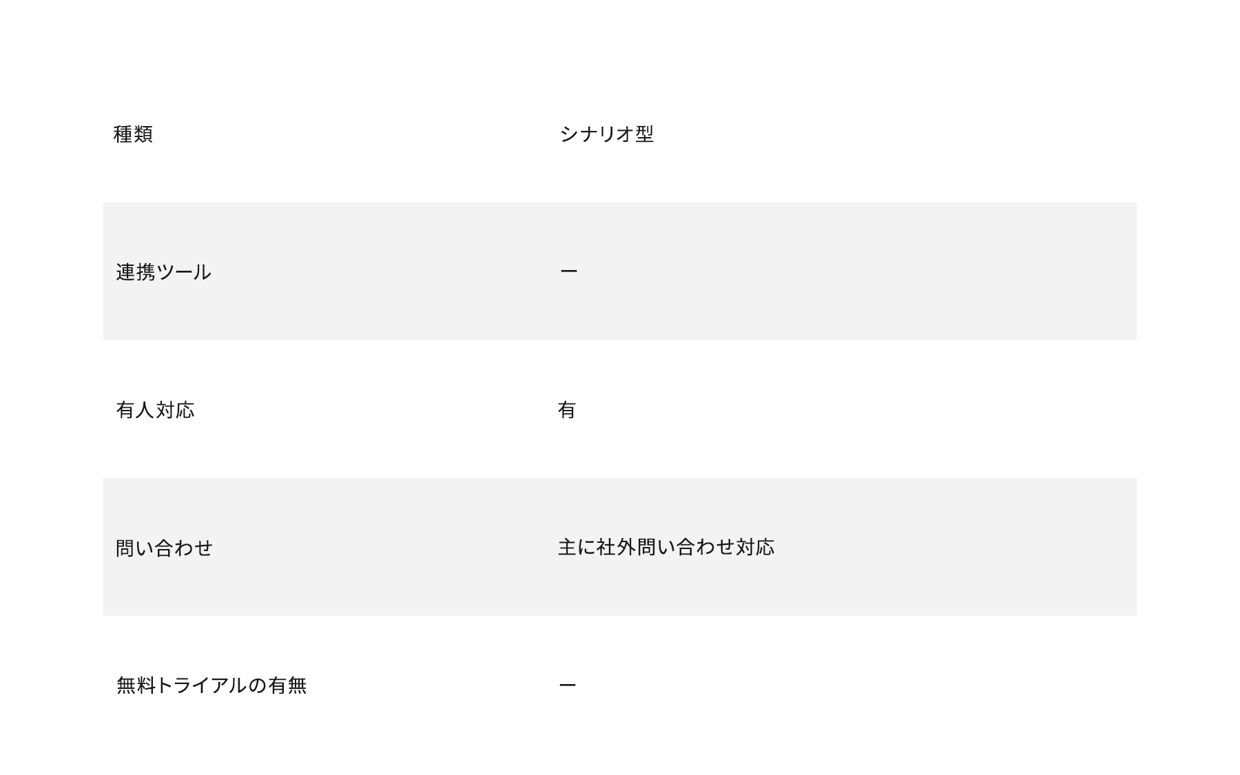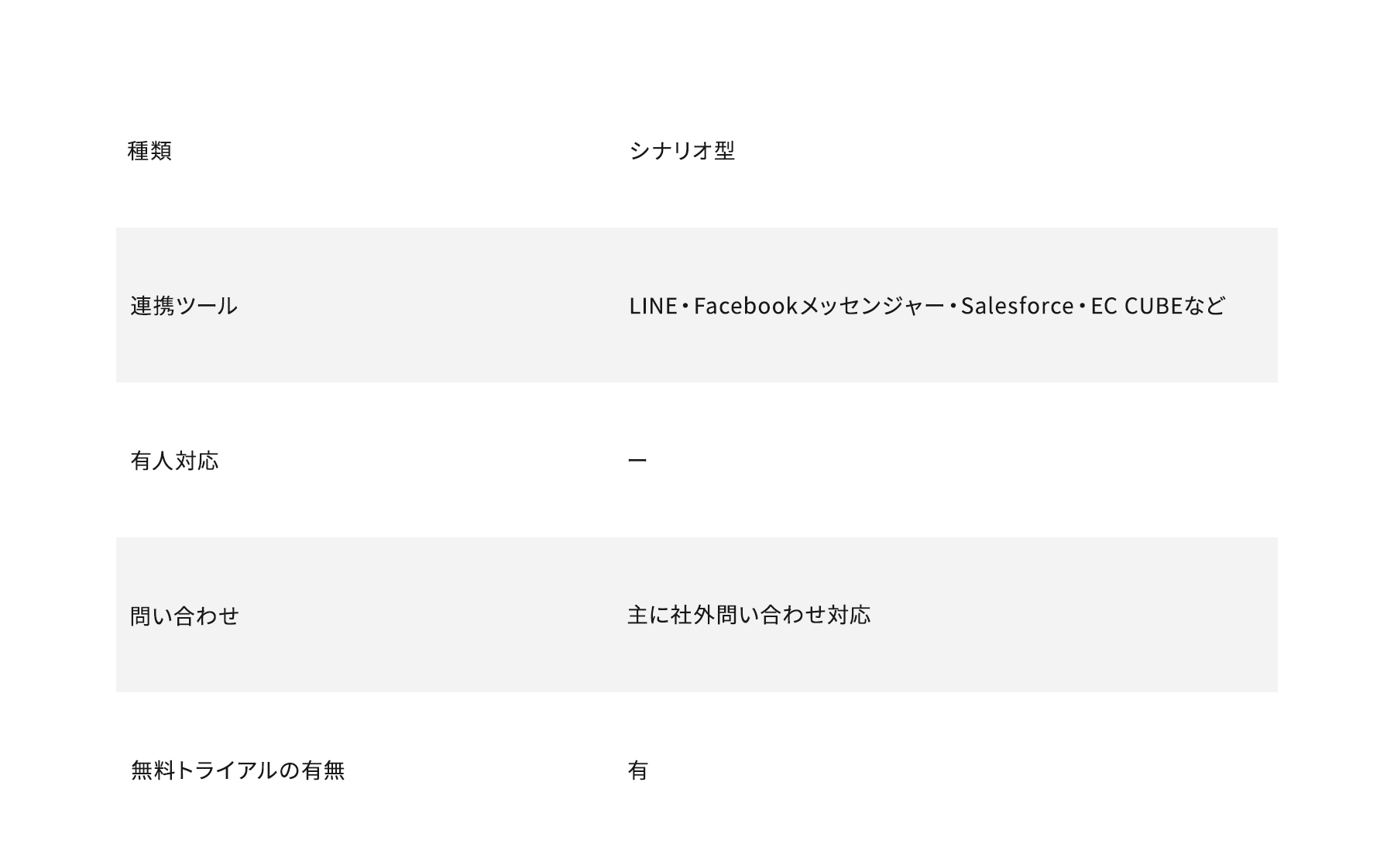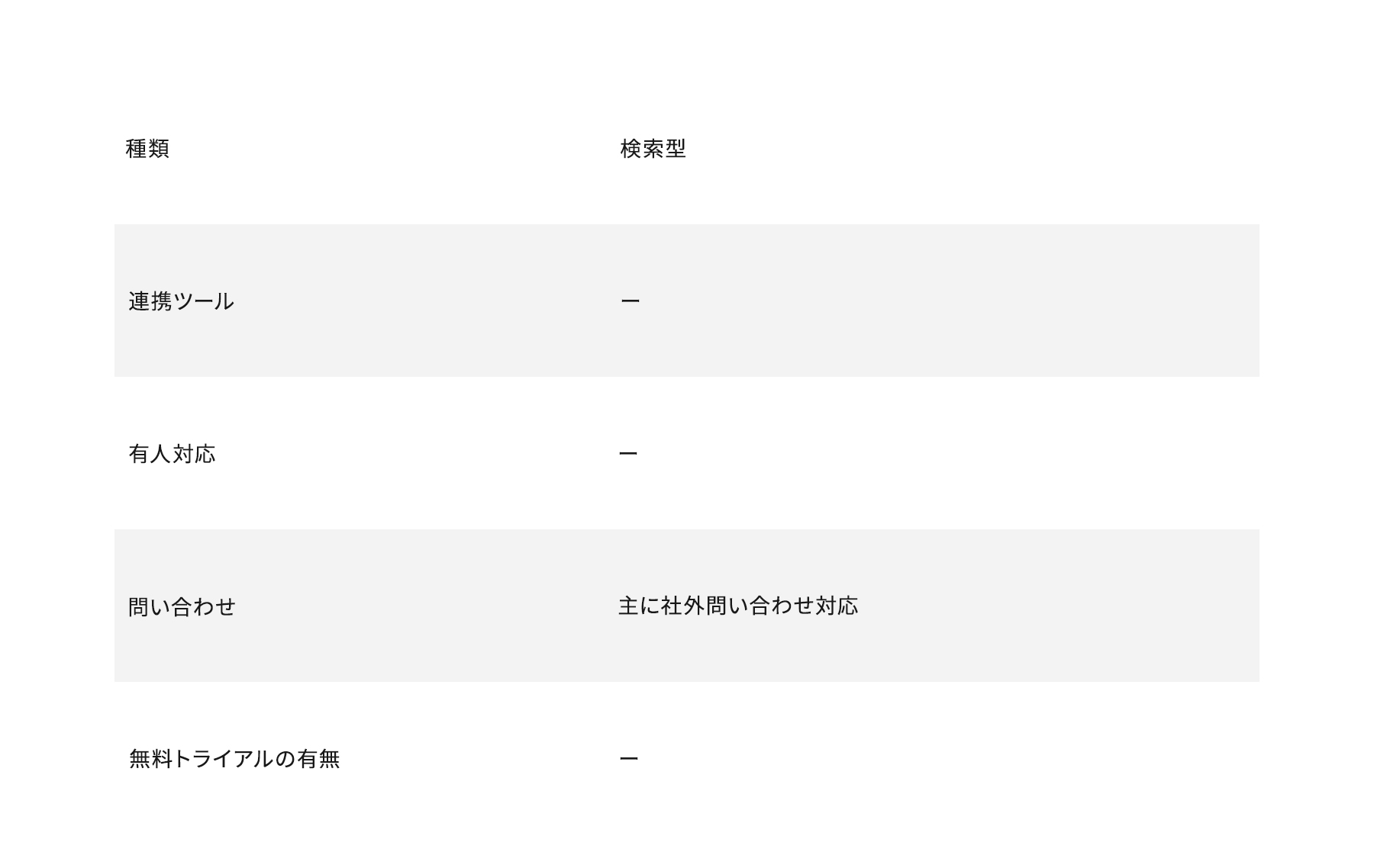 次項から、種類・連携ツール・有人対応・問い合わせ・無料トライアルの有無などに分けて詳しく比較するので参考にしてください。