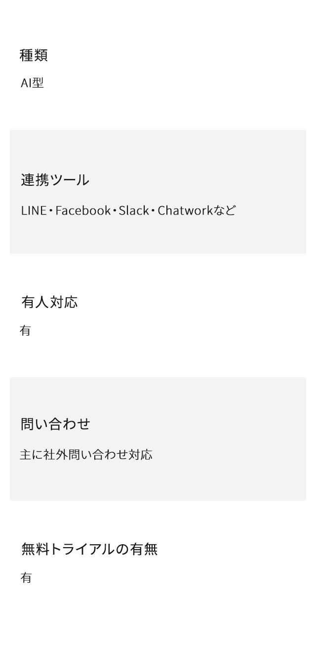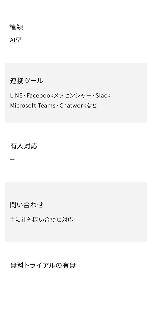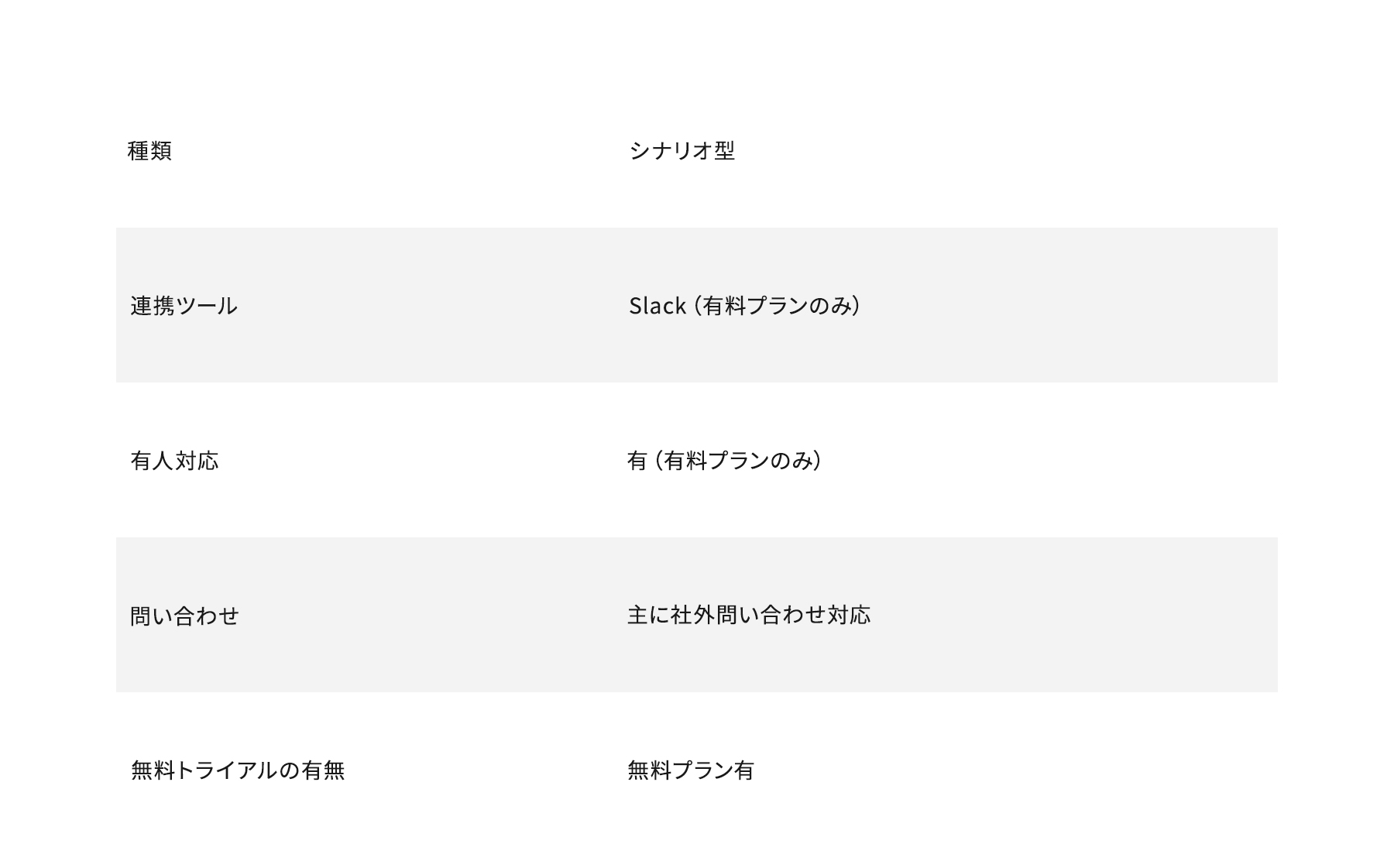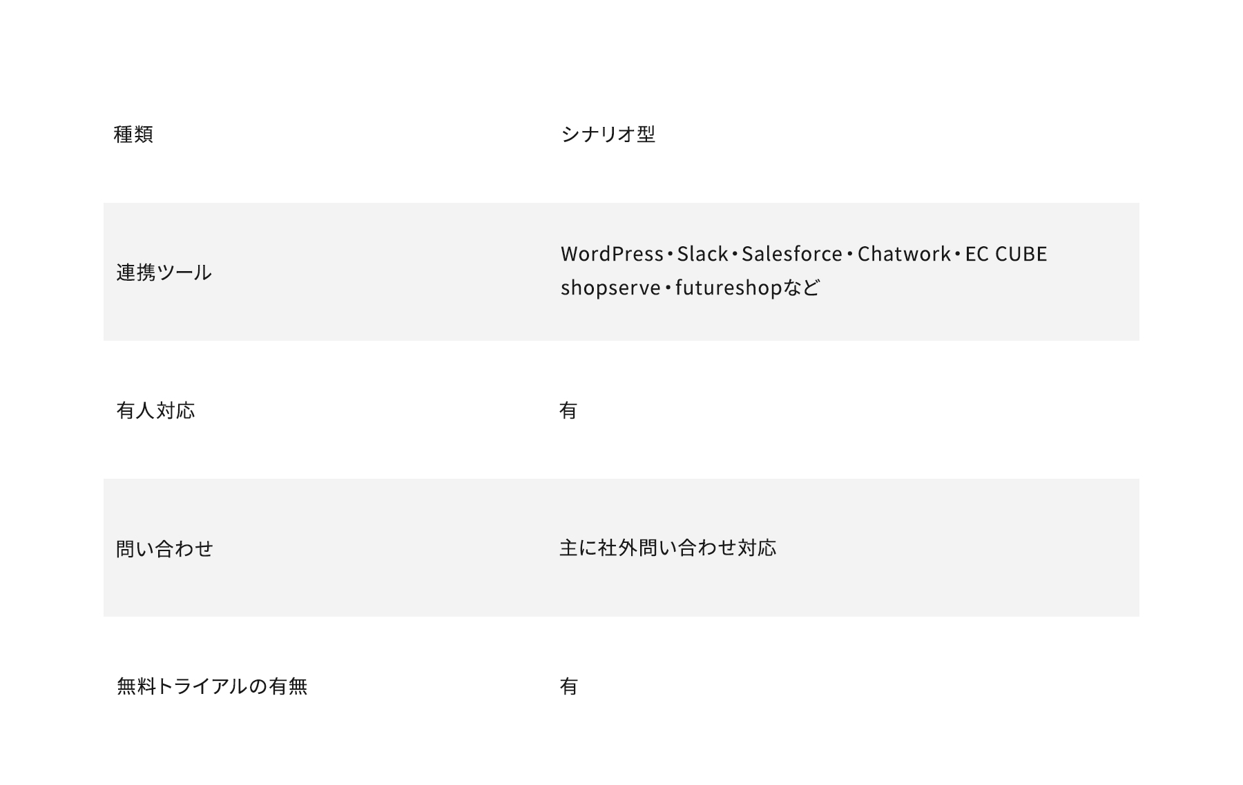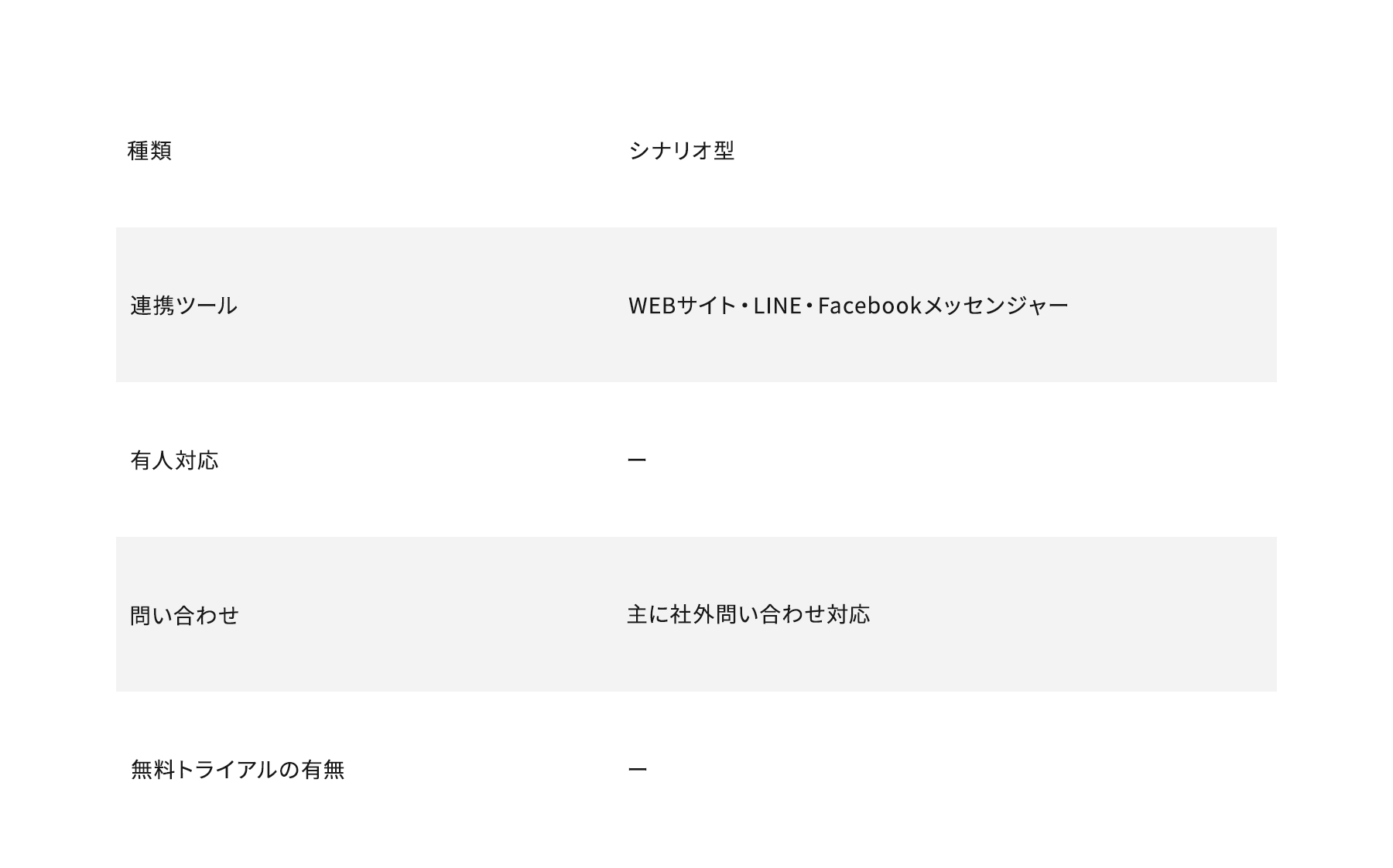 次項から、種類・連携ツール・有人対応・問い合わせ・無料トライアルの有無などに分けて詳しく比較するので参考にしてください。