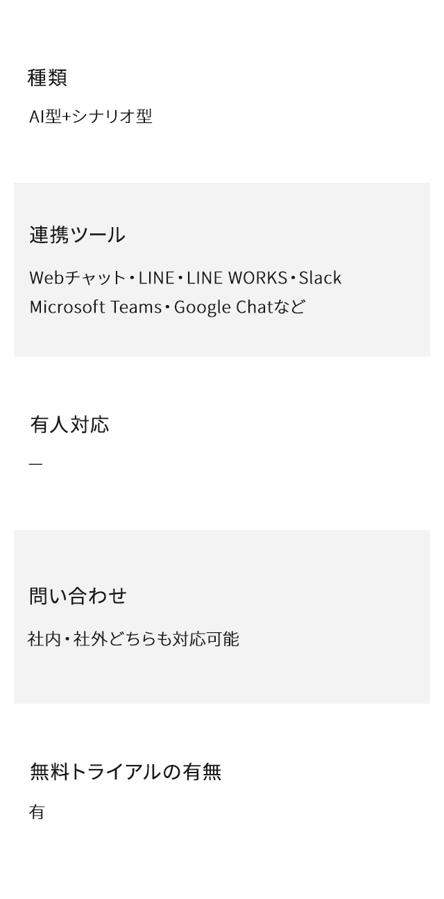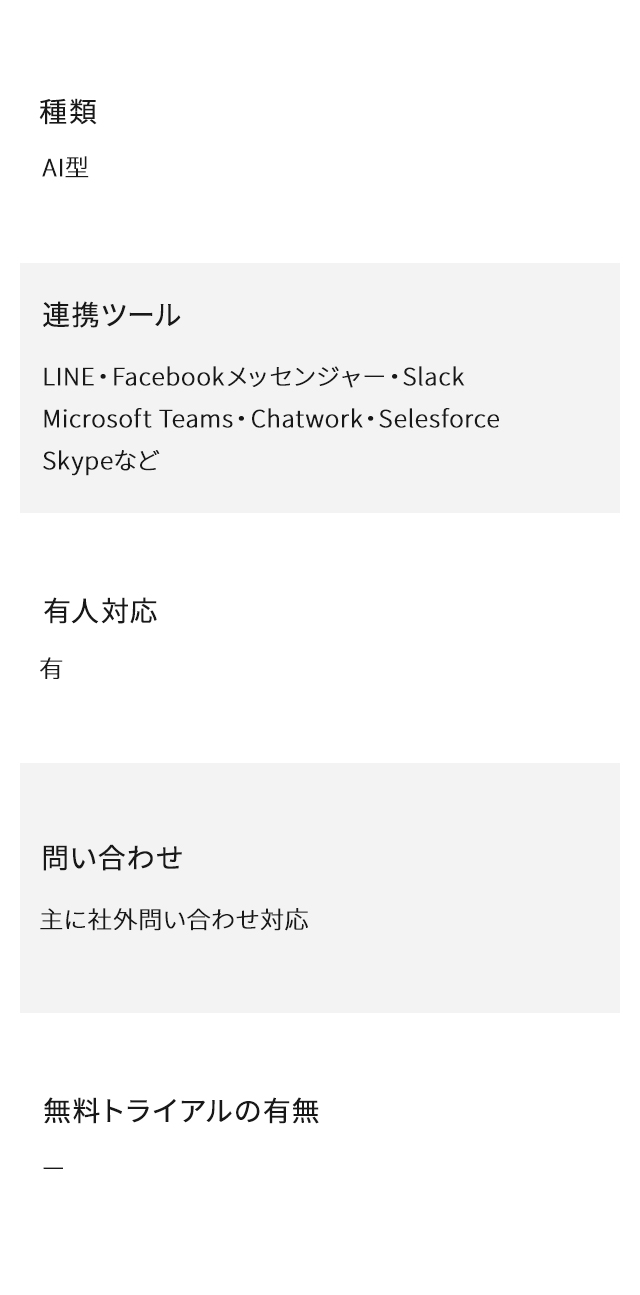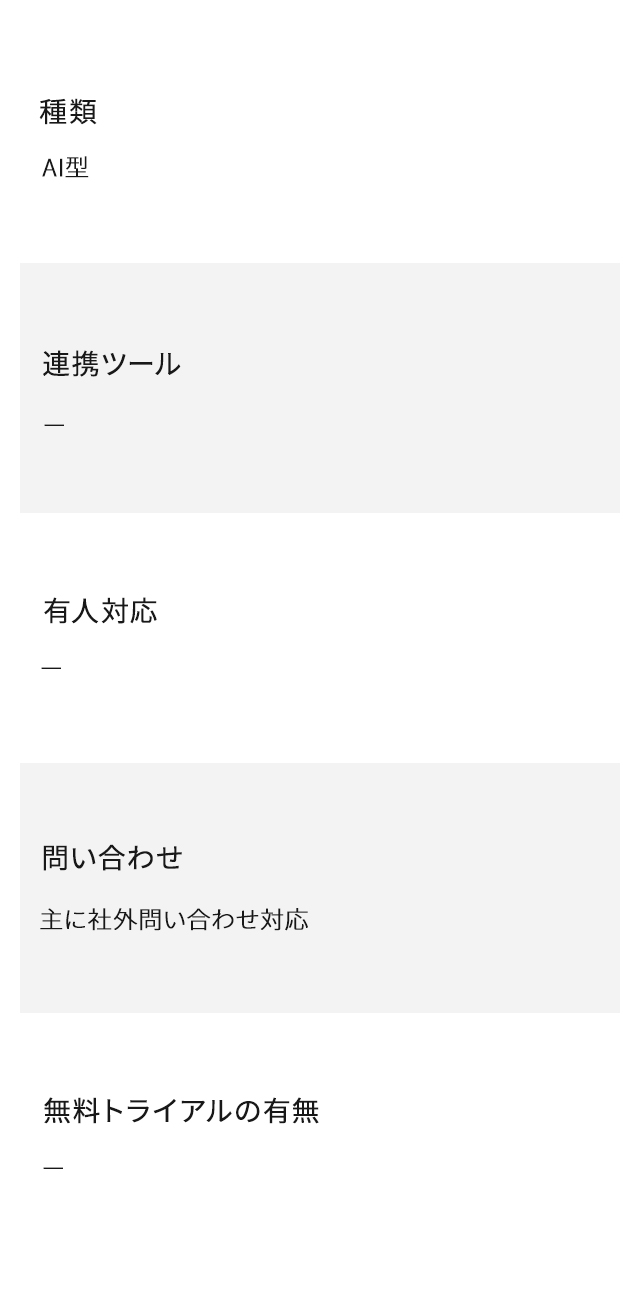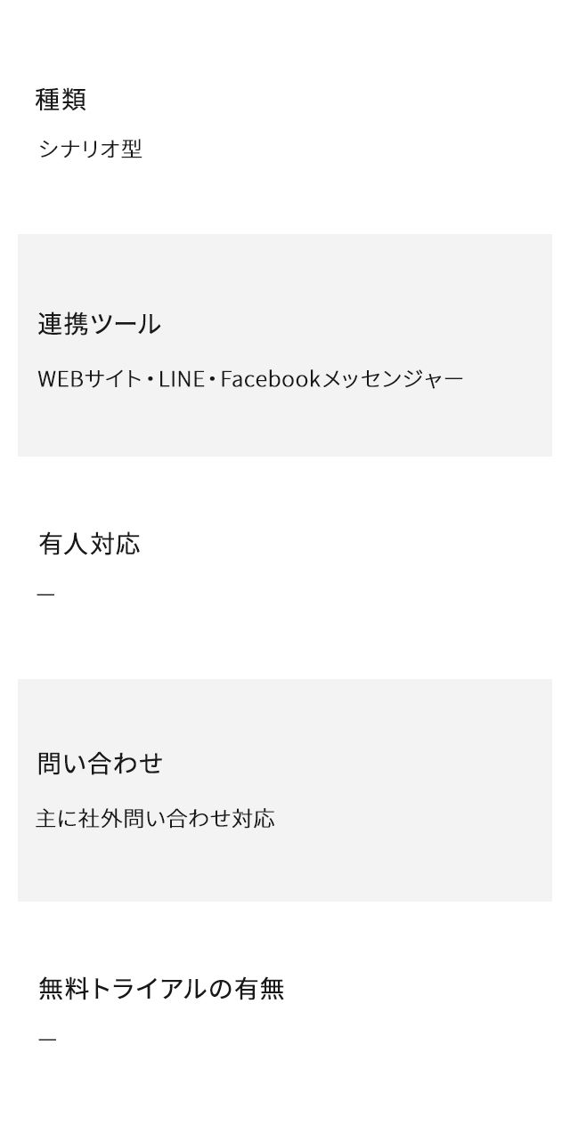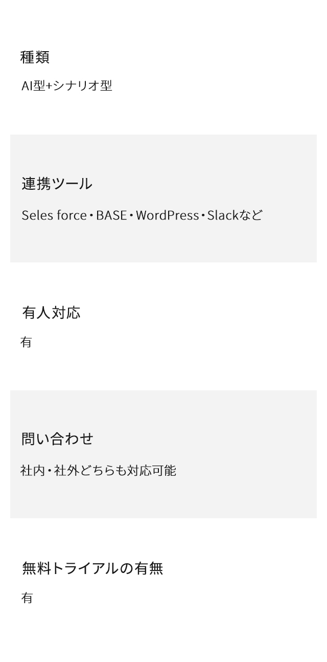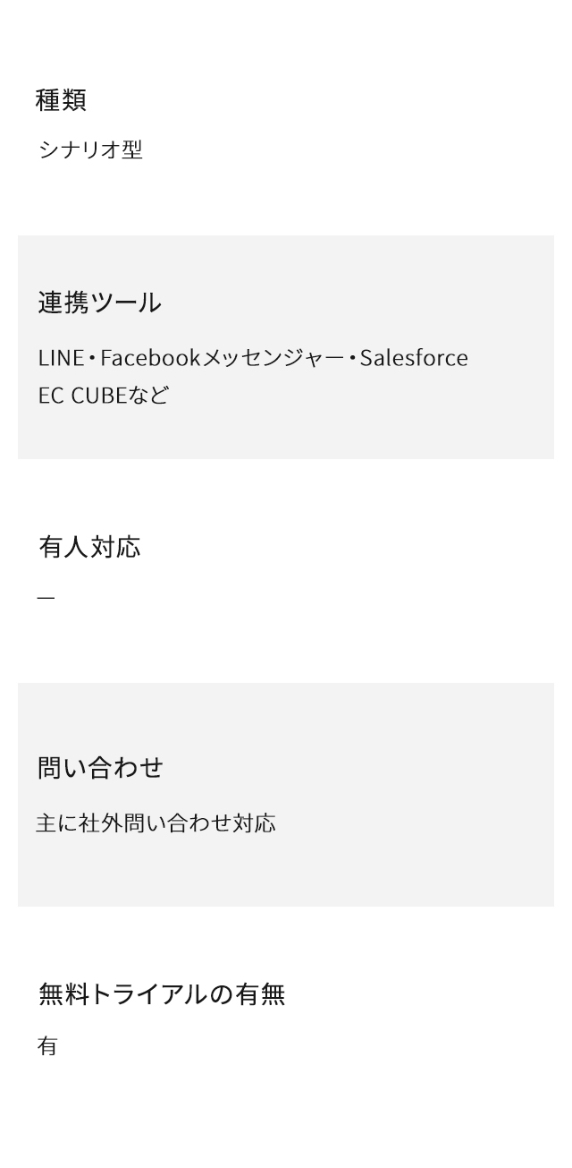 次項から、種類・連携ツール・有人対応・問い合わせ・無料トライアルの有無などに分けて詳しく比較するので参考にしてください。