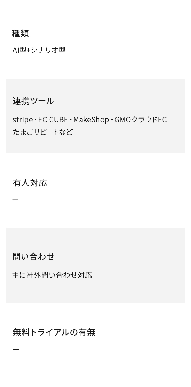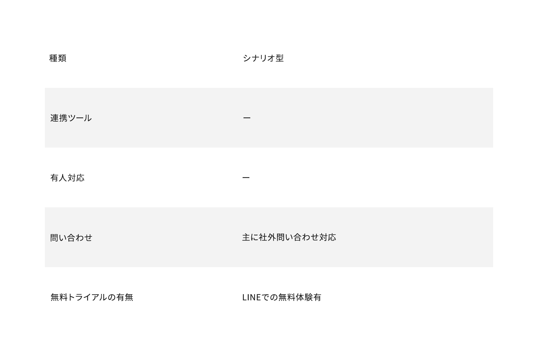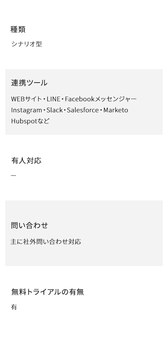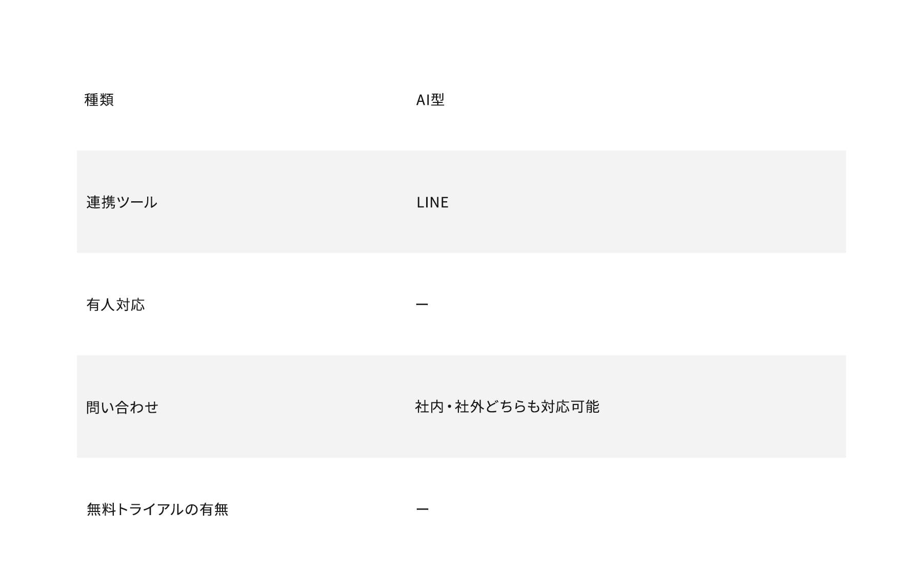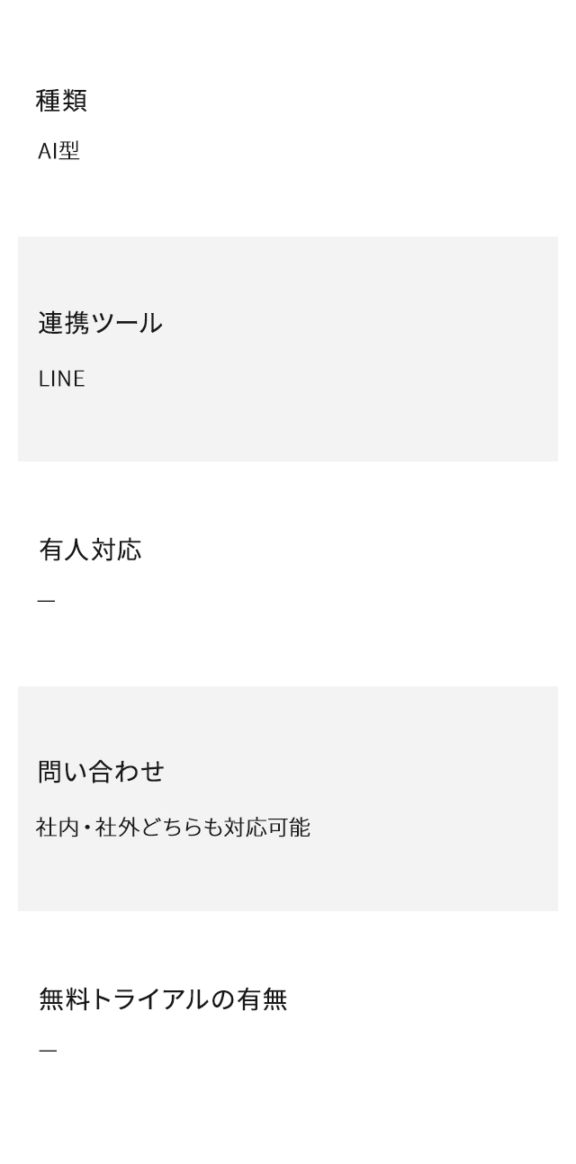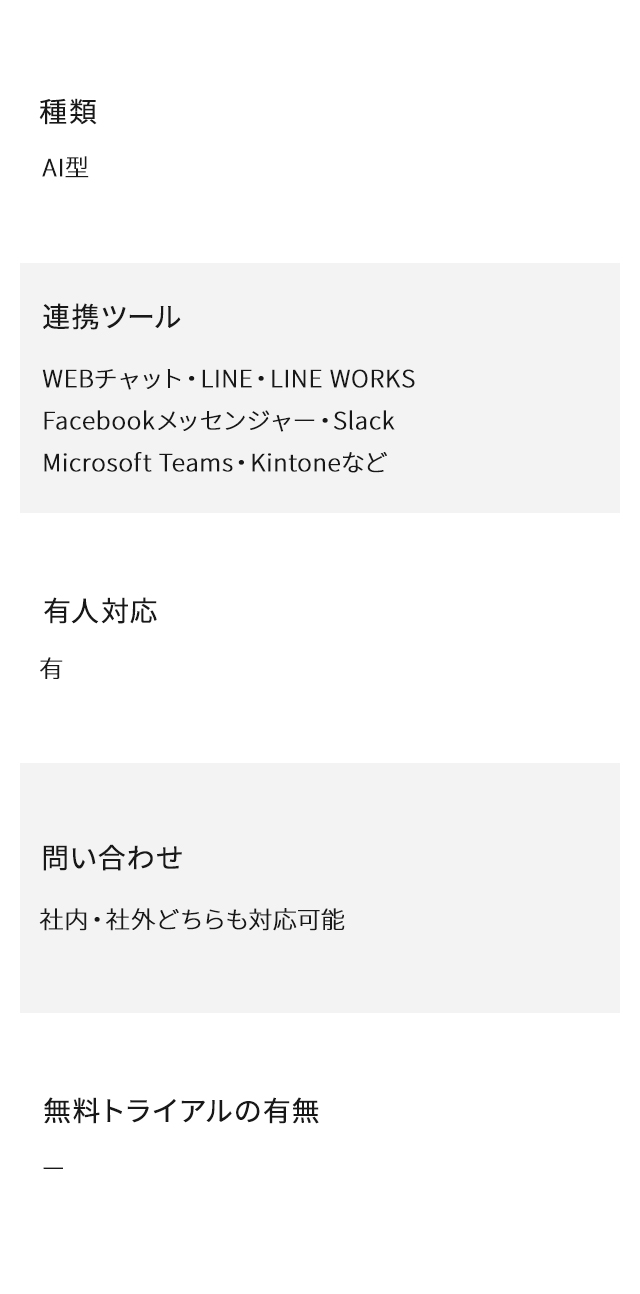 次項から、種類・連携ツール・有人対応・問い合わせ・無料トライアルの有無などに分けて詳しく比較するので参考にしてください。