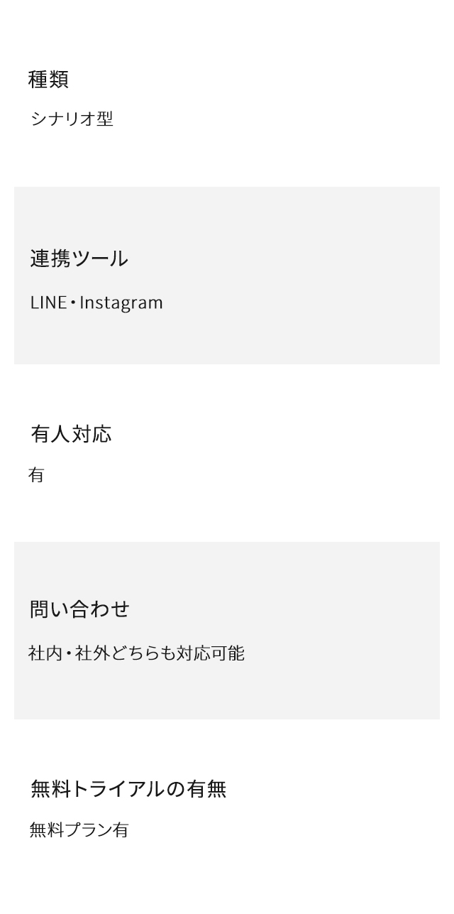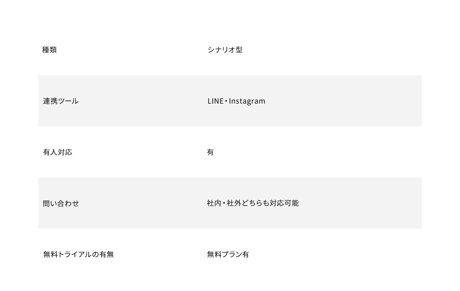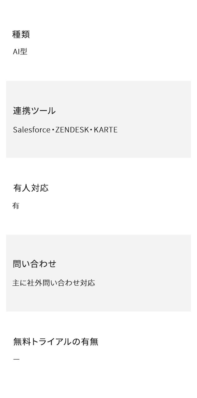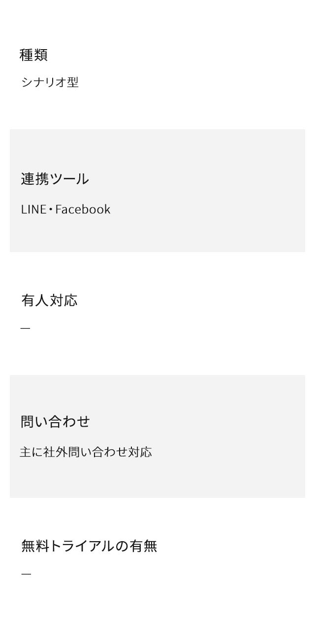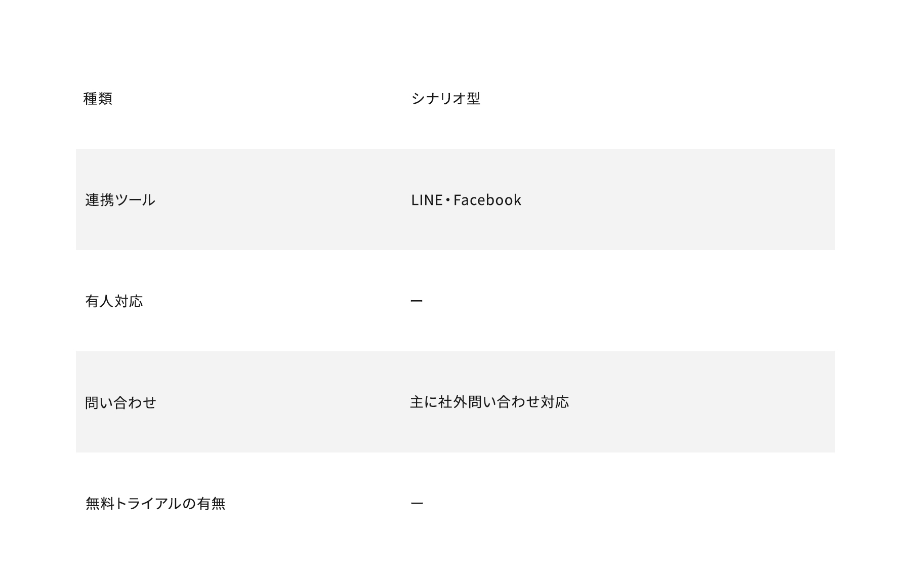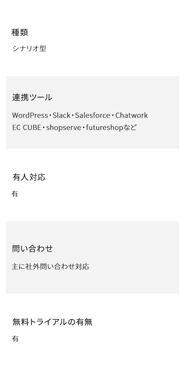 次項から、種類・連携ツール・有人対応・問い合わせ・無料トライアルの有無などに分けて詳しく比較するので参考にしてください。