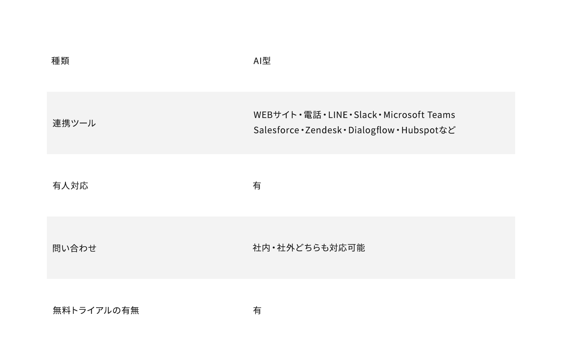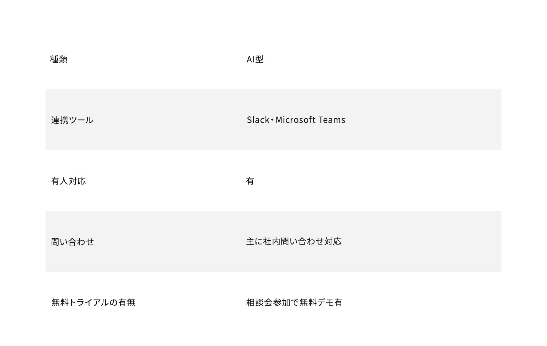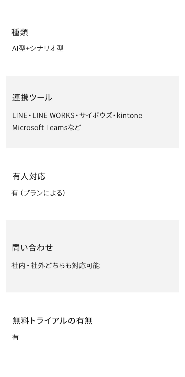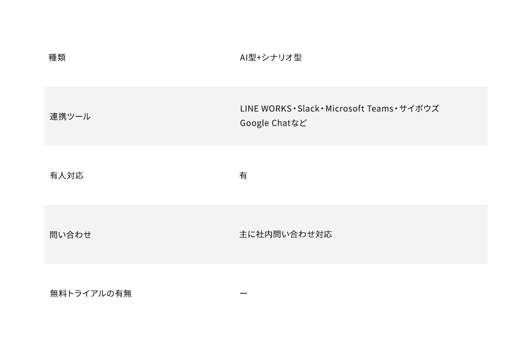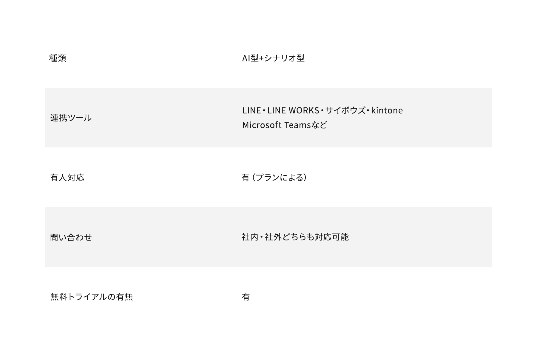 主に社内問い合わせ向けにビジネスチャットやCRMツール、グループウェアと連携可能