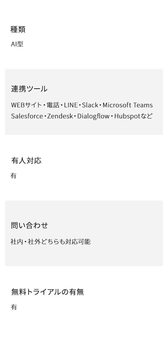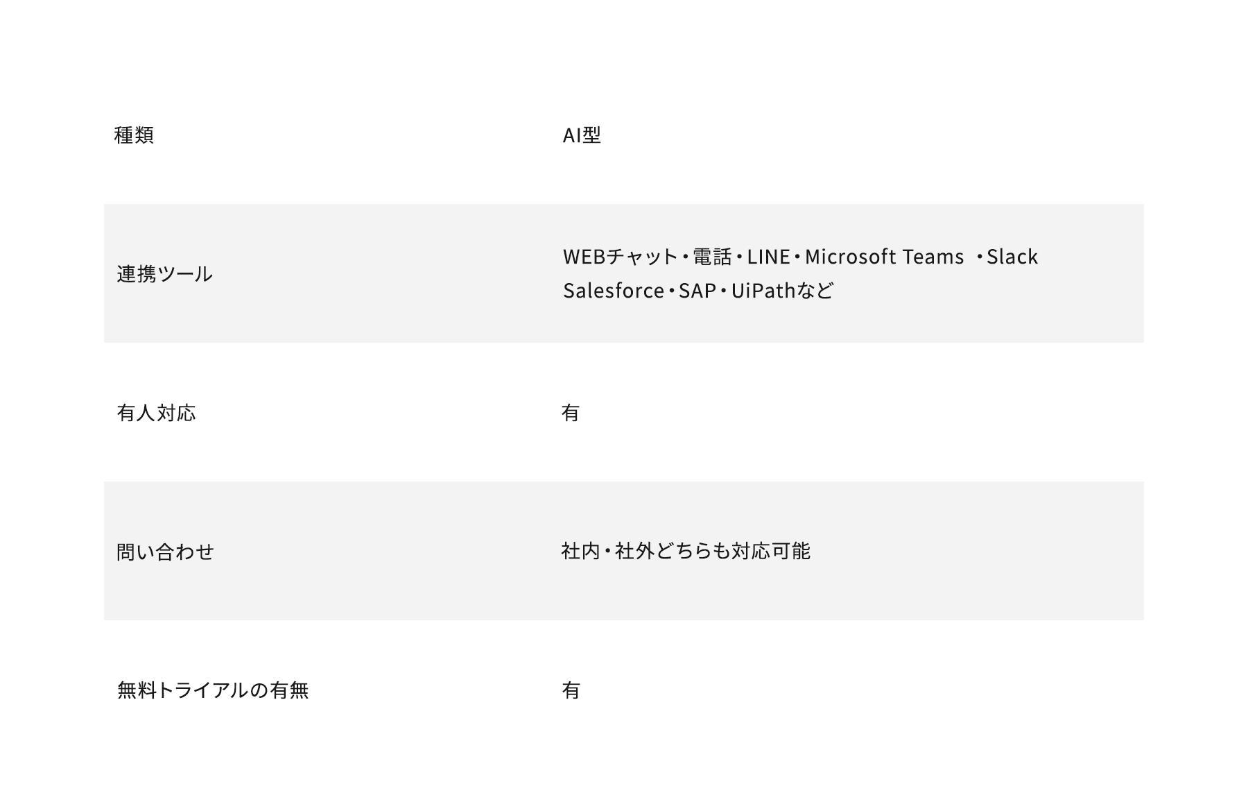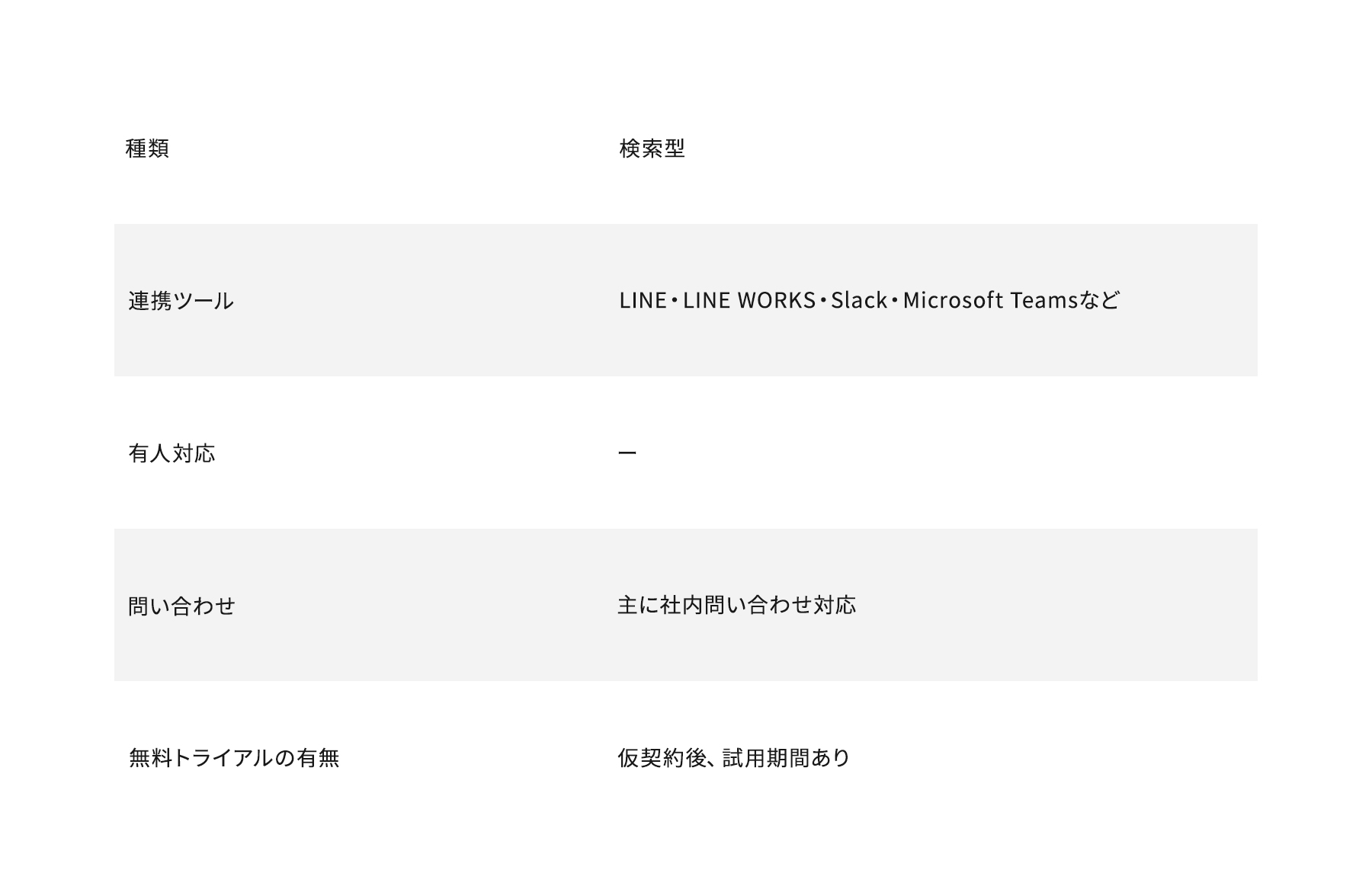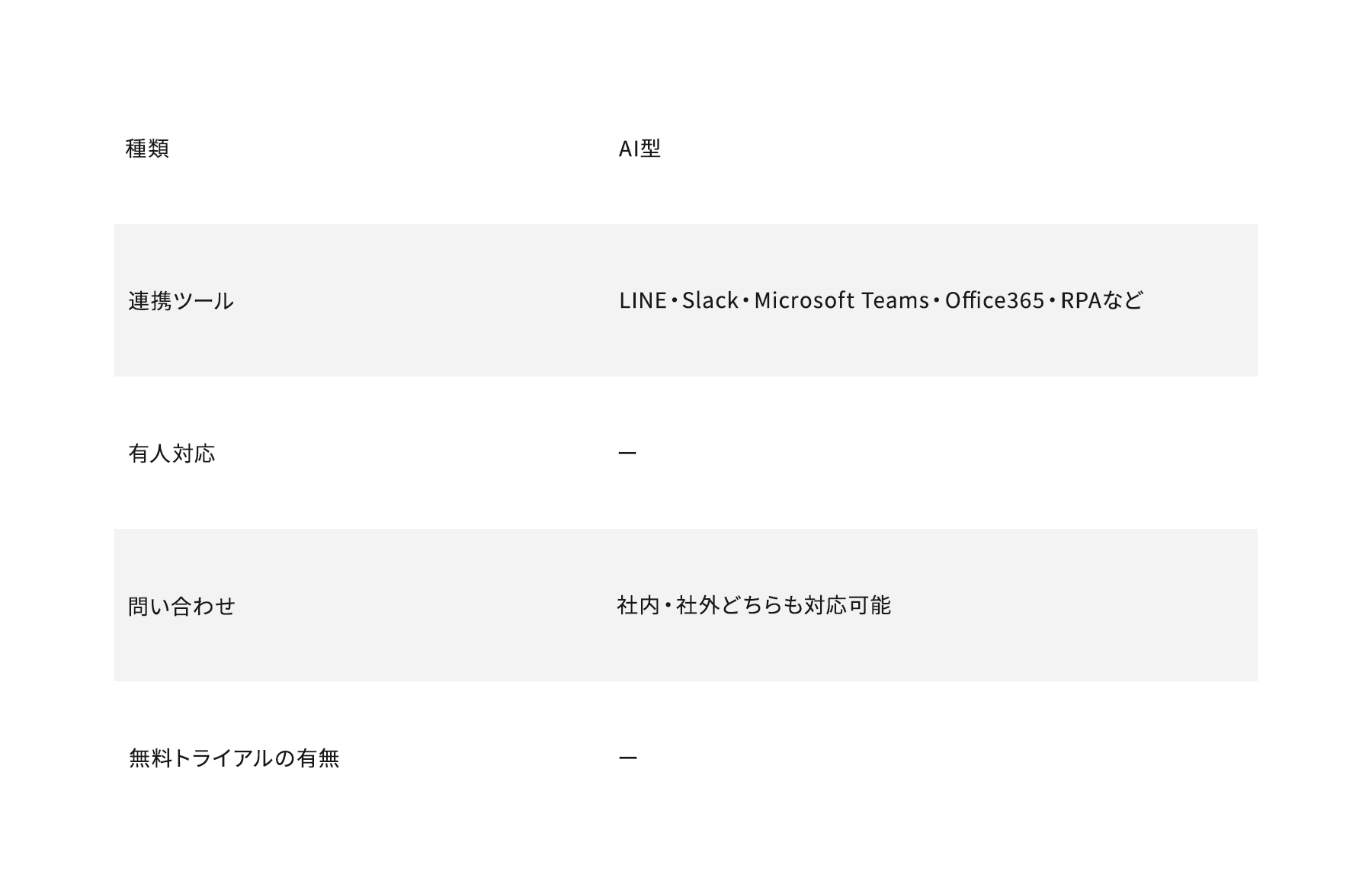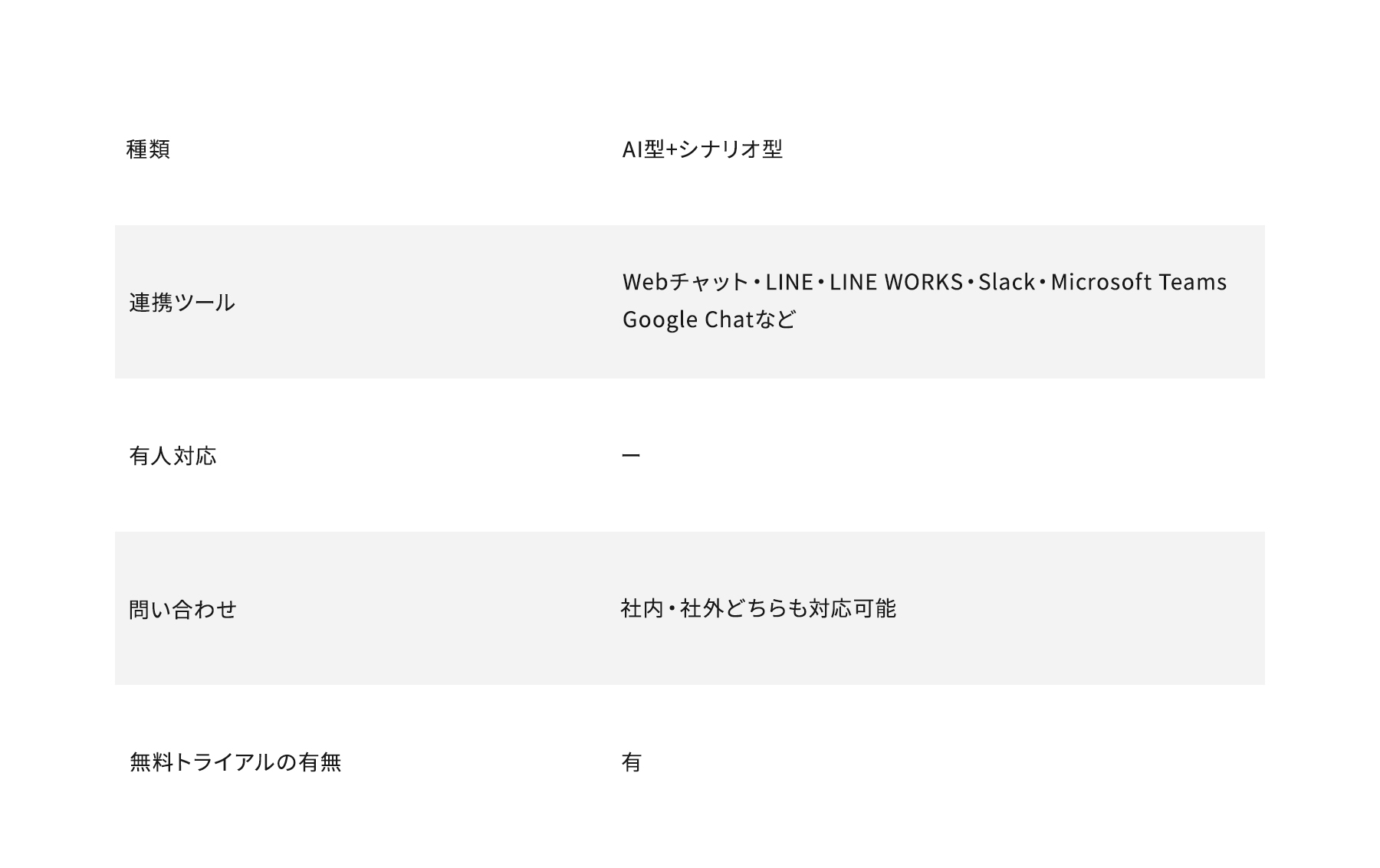 主に社内問い合わせ向けにビジネスチャットやCRMツール、グループウェアと連携可能