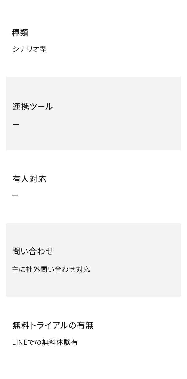 フローチャート形式、一問一答形式、アンケート形式と3種類のチャットボットを作成でき、有人チャットとの連も可能