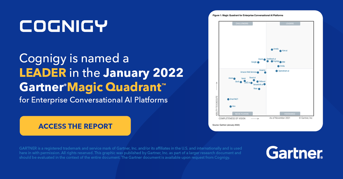 弊社取り扱いプロダクトのCognigyが、2022年Gartner® Magic Quadrant™ for Enterprise Conversational AI Platformsのリーダーに選ばれました。
