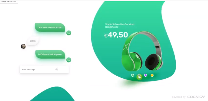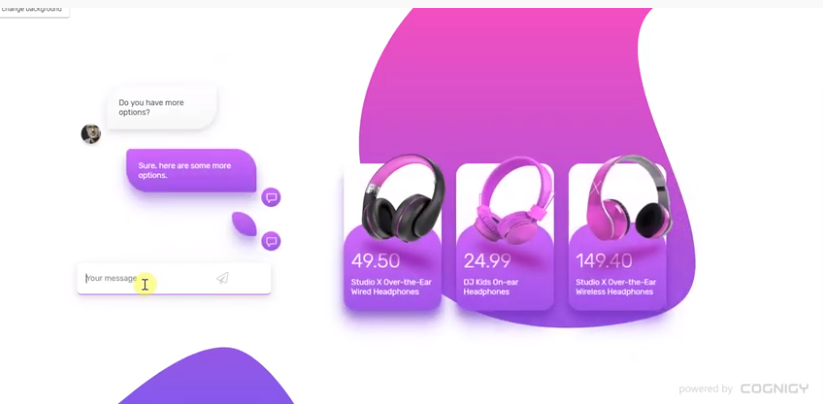 WEBサイト上にCognigyで作成したAIチャットボットをヘッドホンのECサイトに導入します。顧客がテキスト入力欄から会話を始めれば接客がスタートします。まずはおすすめの商品を提示し、「こんな商品はいかがでしょうか」と顧客に尋ねます。